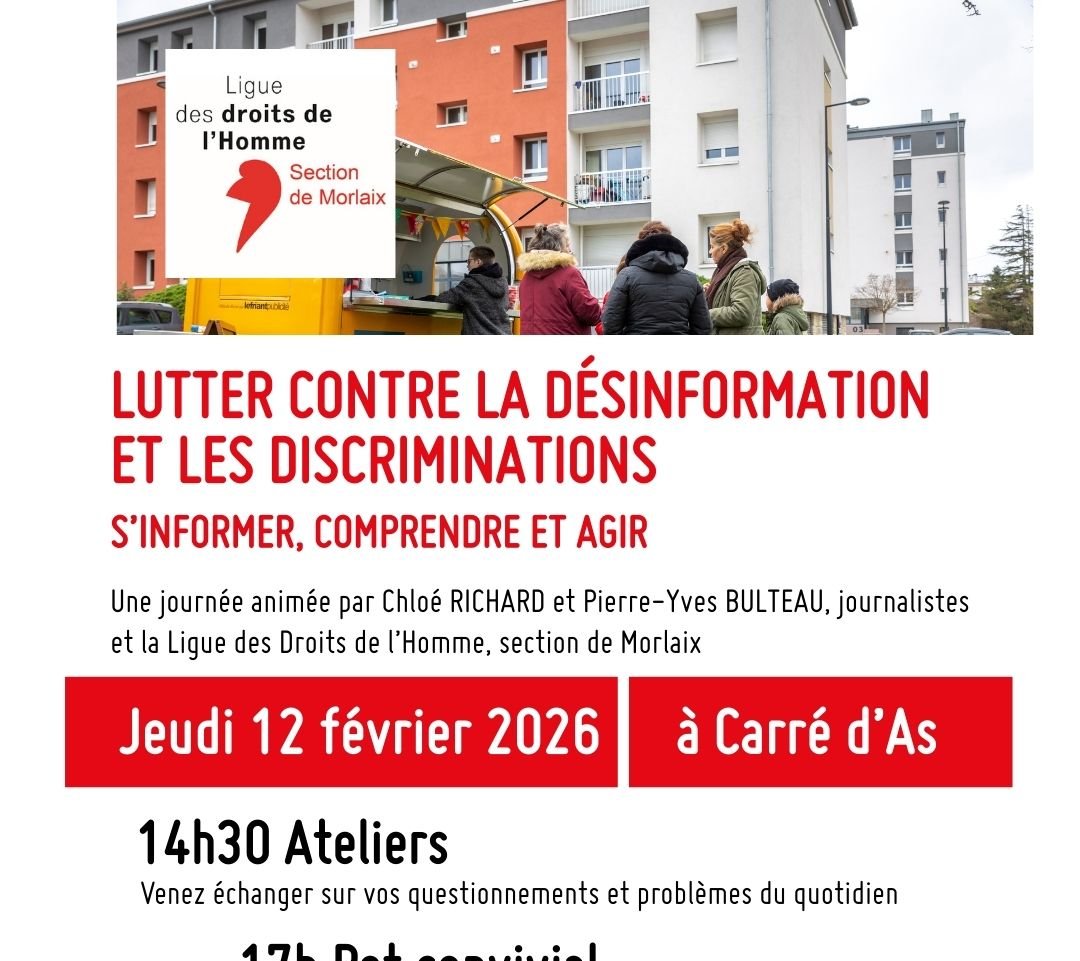 Les ateliers seront animés par deux journalistes et la Ligue des Droits de l’Homme de Morlaix ) partir de 14h30. Un pot convivial et un temps de (…)