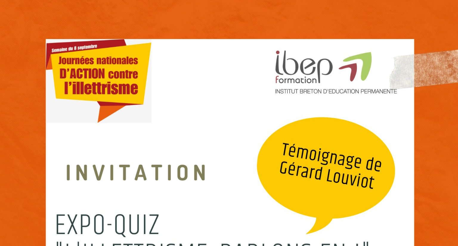 Expo-quiz "L’illettrisme, parlons-en !"Mardi 13 septembre 2022 de 09h00 à 12h00 | dans les locaux de l'association "Droit à l'emploi" Institut Breton d’Education Permanente - IBEP Lire la suite