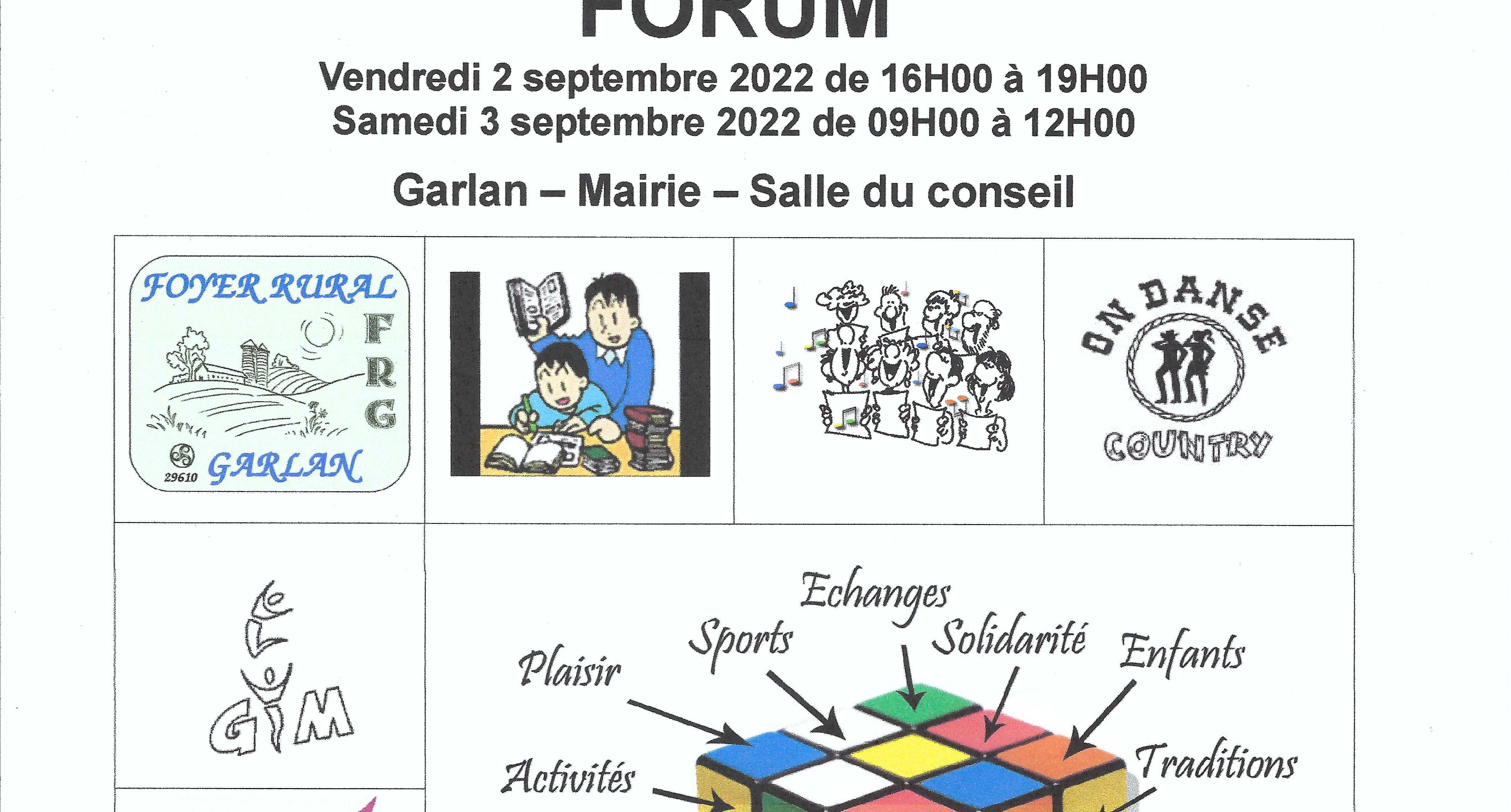 FORUM DU FOYER RURAL - 2 et 3 septembreVendredi 2 septembre 2022 de 13h44 à 14h44 | Garlan - Salle du conseil - Mairie de Garlan Foyer Rural de Garlan Lire la suite