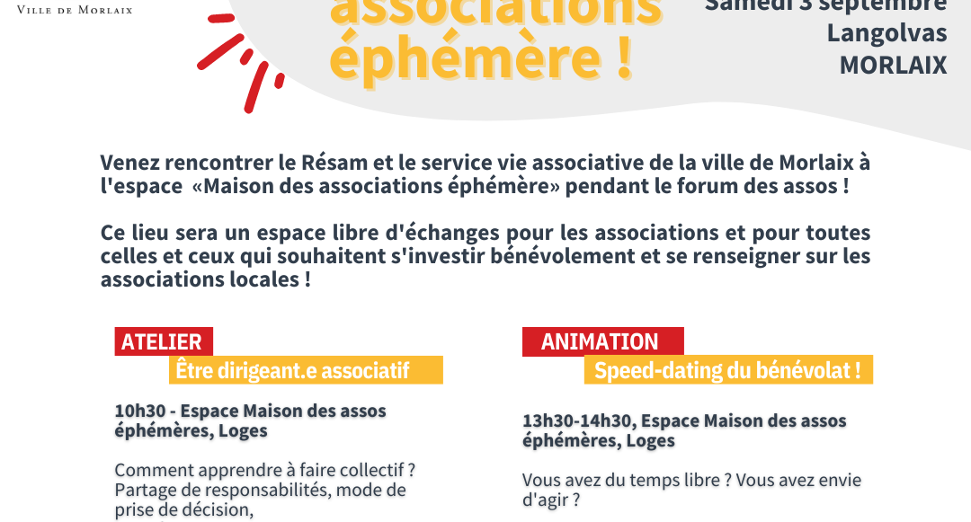 Fête des associations - MORLAIXSamedi 3 septembre 2022 de 10h00 à 17h30 | ZAC de Langolvas - Parc des expositions Réseau d’Echanges et de Services aux Associations du pays de Morlaix - Résam Lire la suite