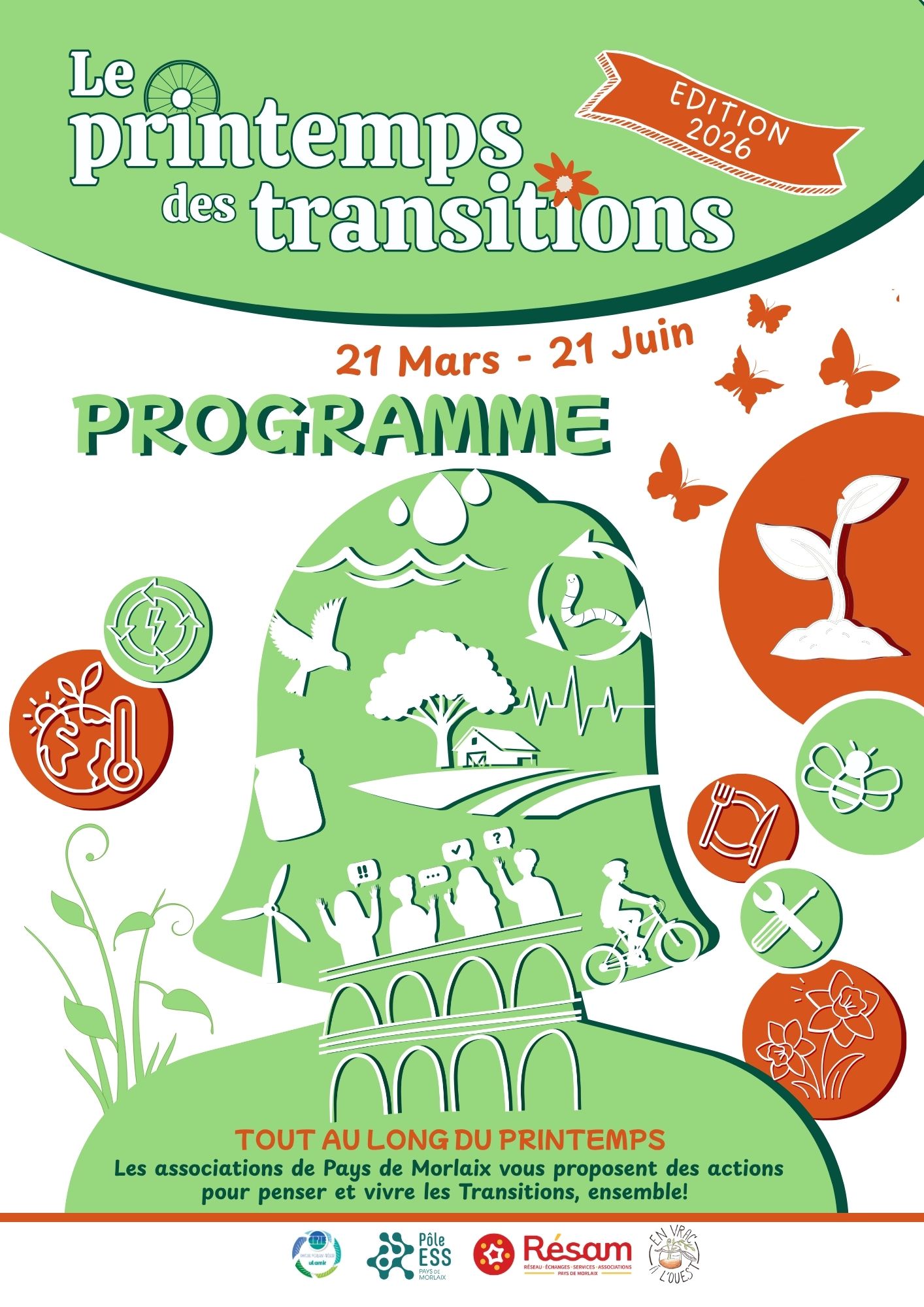 Porté par un collectif associatif (Résam, Ulamir-CPIE, Pôle ESS et En Vrac à l’Ouest), le Printemps des Transitions propose une vingtaine de rendez-vous sur tout le territoire de Morlaix Communauté du 21 mars au 21 juin 2026. La programmation sera joyeuse et positive pour découvrir les initiatives locales liées aux Transitions.