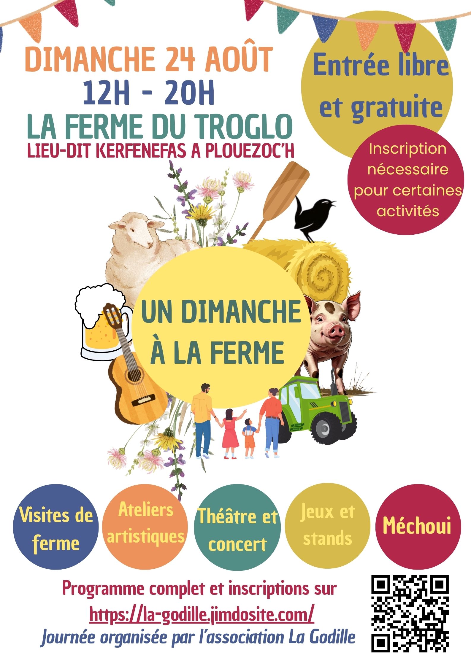 Venez passer un dimanche à la ferme du Troglo, au programme : visites de ferme, ateliers artistiques, théâtre, repas fermier (méchoui) et concert !