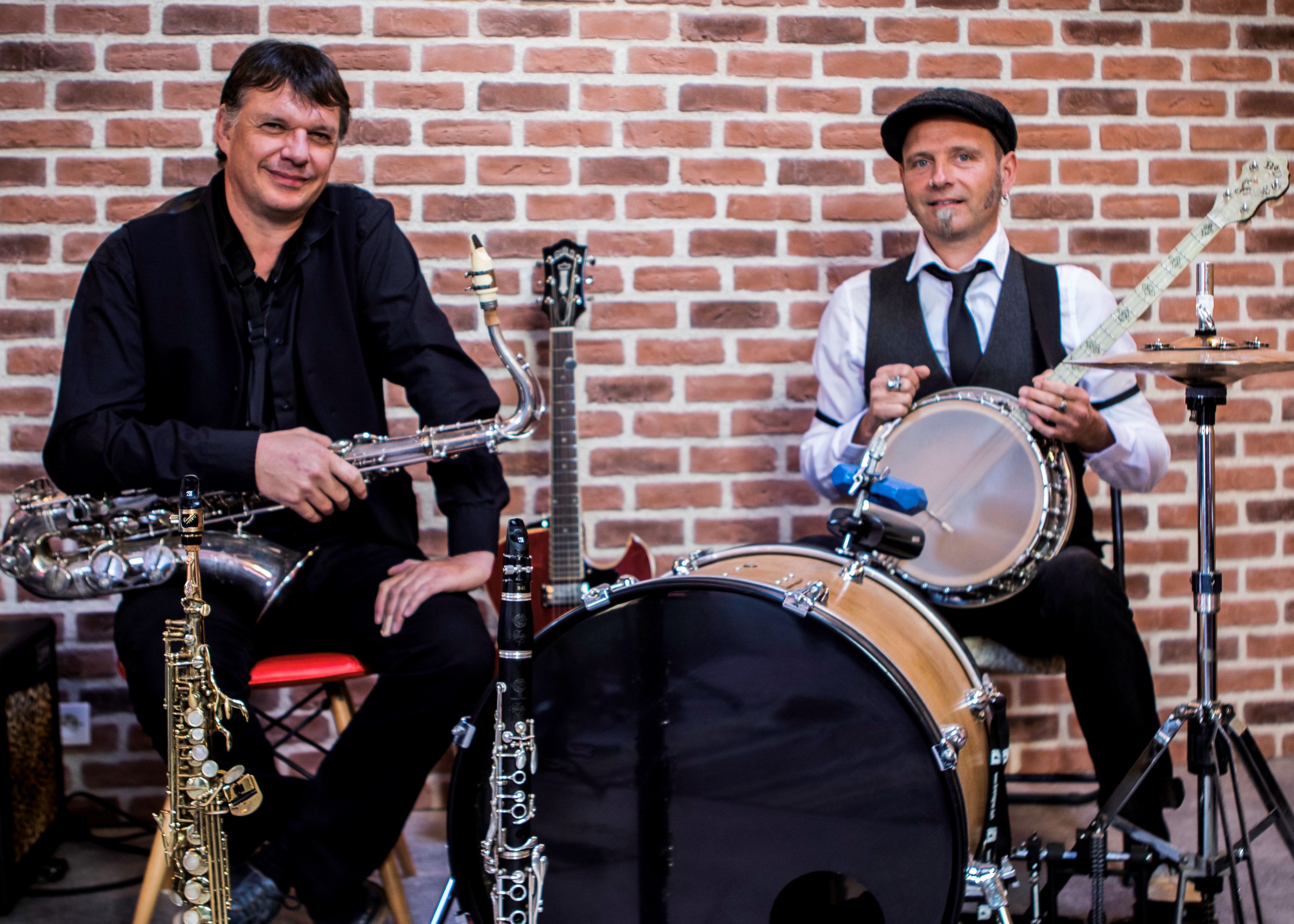 Le « One Man Band » (chant, batterie aux pieds, banjo ou guitare) de Yann-Gireg LE BARS est complété par la complicité de la clarinette ou des saxophones enjoués de Franck FAGON, dans le style des grands interprètes qui ont marqués les débuts du jazz.